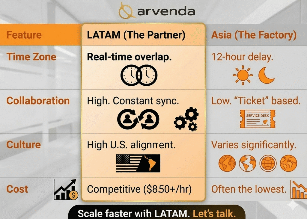 Comparative infographic by Arvenda showing the differences between LATAM and Asia for remote staffing, highlighting LATAM’s real-time overlap, cultural alignment, and $8.50/hour starting rate.